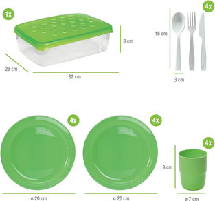 Set per 4 persone di piatti, bicchieri, posate + contenitore