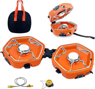 Bruciatori Doppi Multifunzionali: Il fornello da campeggio è dotato di 2 bruciatori in acciaio inox, in grado di cucinare due piatti diversi contemporaneamente; si riscalda rapidamente con una potenza totale di 15.000 BTU, risparmiando tempo di cottura